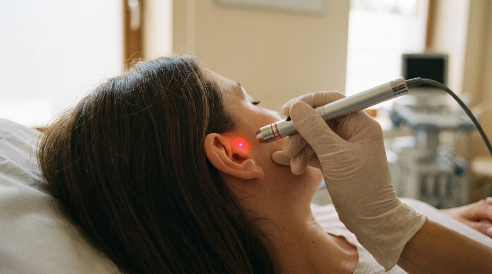 La méthode utilise un laser froid de faible intensité, inspiré de l’auriculothérapie. Il ne chauffe pas, ne brûle pas, mais stimule des points précis – surtout sur les oreilles, parfois sur le visage ou les mains – à la manière d’une acupuncture sans aiguille ni douleur.